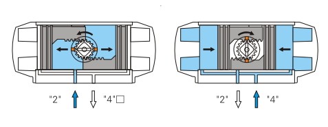 當(dāng)氣源壓力從氣口(2)進(jìn)入氣缸兩活塞之間中腔時(shí),使兩活塞分離向氣缸兩端方向移動(dòng),兩端氣腔的空氣通過(guò)氣口(4)排除, 同時(shí)使兩活塞齒條同步帶動(dòng)輸出軸(齒輪)逆時(shí)針?lè)较蛐D(zhuǎn)。反之氣源壓力從氣口(4)進(jìn)入氣缸兩端氣腔時(shí),使兩活塞向 氣缸中間方向移動(dòng),中間氣腔的空氣通過(guò)氣口(2)排除,同時(shí)使兩活塞齒條同步帶動(dòng)輸出軸(齒輪)順時(shí)針?lè)较蛐D(zhuǎn)。 (如果把活塞相對(duì)反方向安裝,輸出軸變?yōu)榉聪蛐D(zhuǎn),即為雙作用反轉(zhuǎn)型)